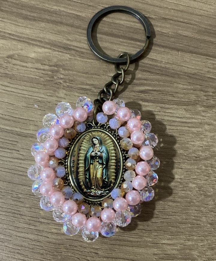 Nosso CHAVEIRO SACRO foi desenvolvido com duas camadas de cristais e uma de pérola, carregando uma medalha resinada com a devoção de Nossa Senhora de Guadalupe