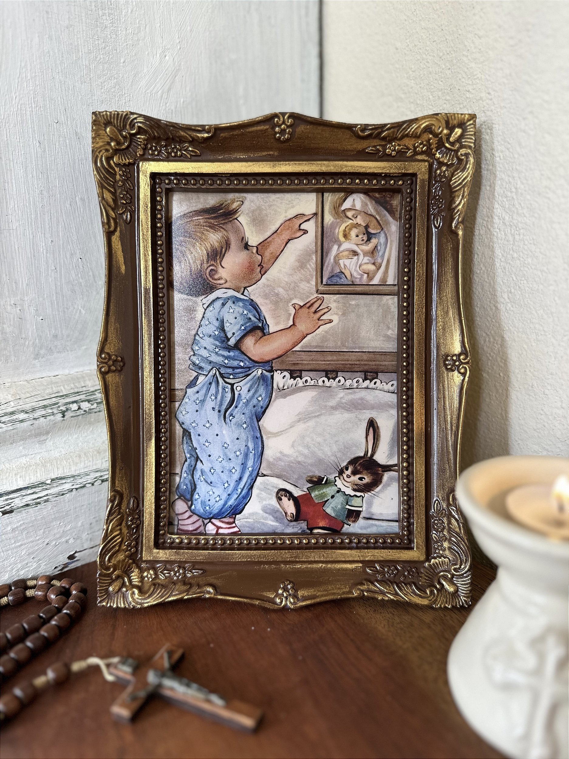 Apresentamos o nosso novo quadro MÃEZINHA DO CÉU - uma delicada estampa que retrata a pureza do coração de uma criança ao encontro da Mãe de Jesus 🩵