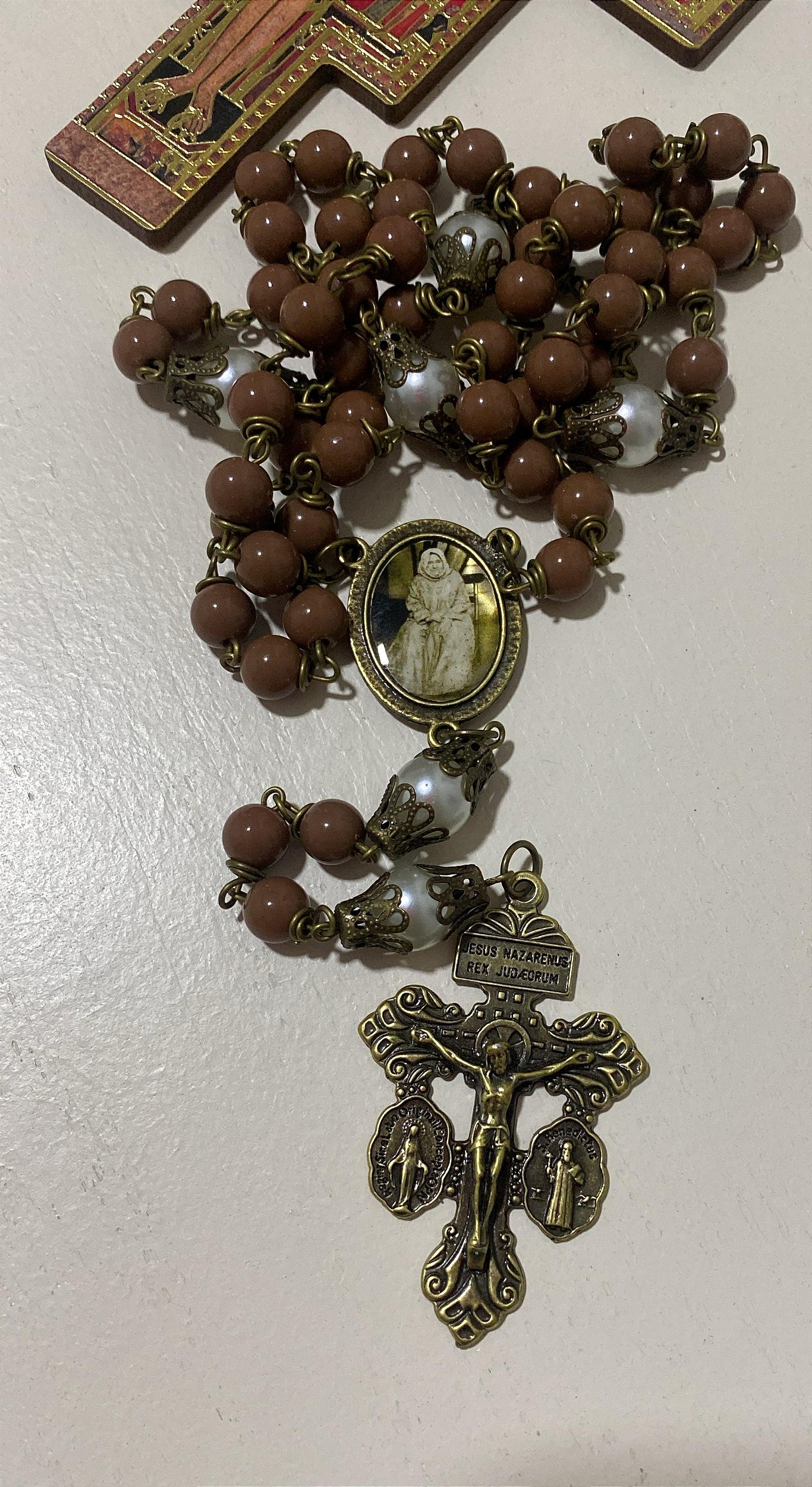 Nosso terço carrega as estampas da Beata Nhá Chica e Nossa Senhora da Imaculada Conceição em seu entremeio principal.