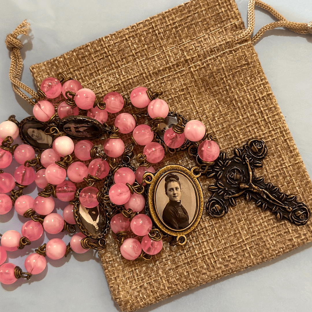 Design Inspirador: Medalhas com cenas da vida de Santa Teresinha tornam este terço único e significativo.